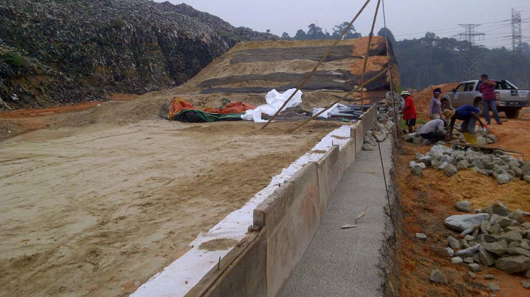 Kuantan Jabor-Jerangau Landfill was first opened in 1993 as the designated landfill for municipal solid waste for the Kuantan town, Pahang, Malaysia. Apart from the landfill, there is also a leachate treatment plant installed at the landfill for treatment of leachate prior to their discharge to the nearby drain. However, because of the increase of solid waste sent to the landfill and there is a lack of additional space to handle the load, part of the landfill had to be closed and upgraded. Huls Engineering which is an expert in geosynthetic materials had came out with a solution of constructing a 'Geogrid Wall' as well as to supply and install geosynthetic materials including manpower to resolve space issues at the landfill.