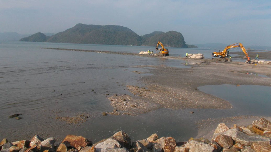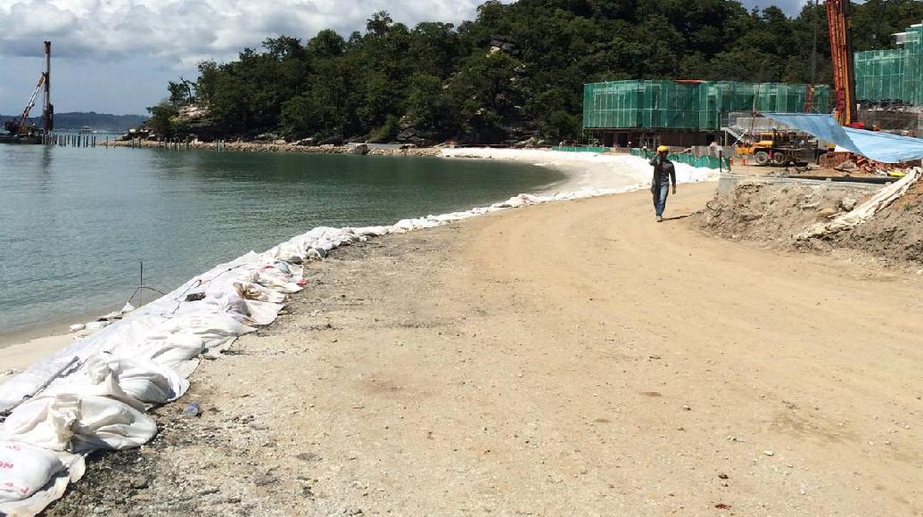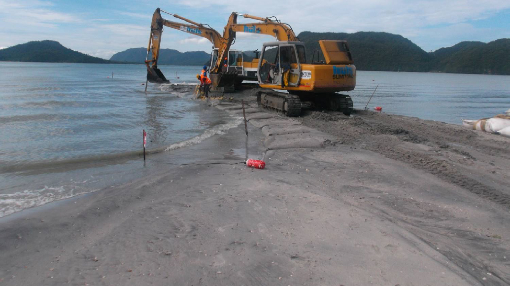 This project aimed to create a lagoon with a permanent water body at all stages of tide and to create a sandy beach and a lagoon with a lagoon with a sandy bottom. Huls Engineering had come out with the solutions which are to construct a fringing reef breakwater to retain the water and placed the sand inside the lagoon to create a sandy bottom. Breakwater was constructed for about 600m length using sand container system as the main material while non-woven geotextile are laid to prevent the mud and silt from being suspended. Meanwhile, rocks were used to cover the sand container system and sand obtained from the land base sources. However, a tidal gate is provided in the breakwater to allow of the lagoon if necessary for maintenance.